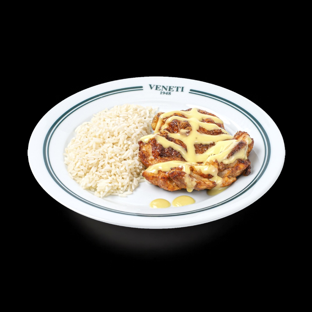 Chicken leg fillet cooked with lemon sauce and mustard. Comes with pilaf rice.
