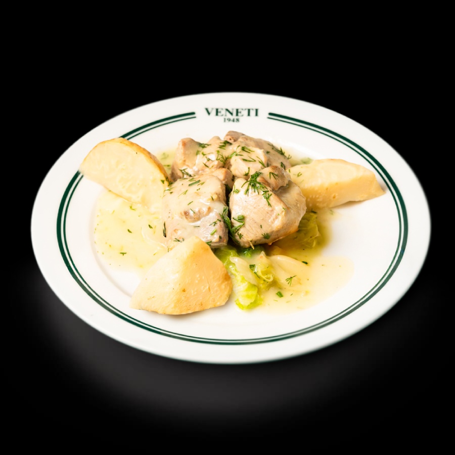 Χοιρινό φρικασέ με σελινόριζα & μαρούλι